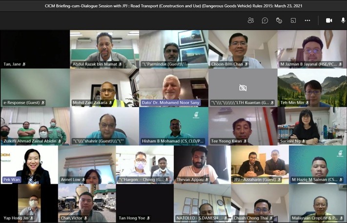 The Briefing-cum-Dialogue Session with JPJ: Road Transport (Construction and Use) (Dangerous Goods Vehicle) Rules 2015 was organized by the CICM Safe Road Committee and held virtually on March 23, 2021. Close to 100 participants joined the session.